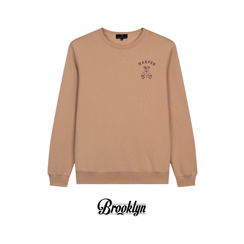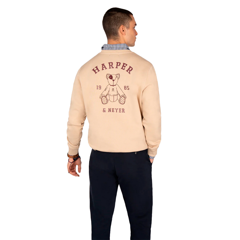 Destaca por su bordado frontal minimalista del icónico oso Arthur y una gran ilustración en la espalda acompañada del logotipo “Harper & Neyer 1985”, con estilo universitario.