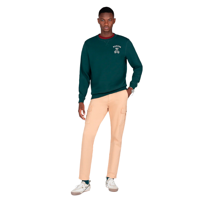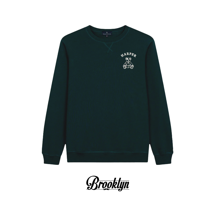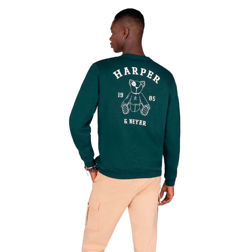 Destaca por su bordado frontal minimalista del icónico oso Arthur y una gran ilustración en la espalda acompañada del logotipo “Harper & Neyer 1985”, con estilo universitario.